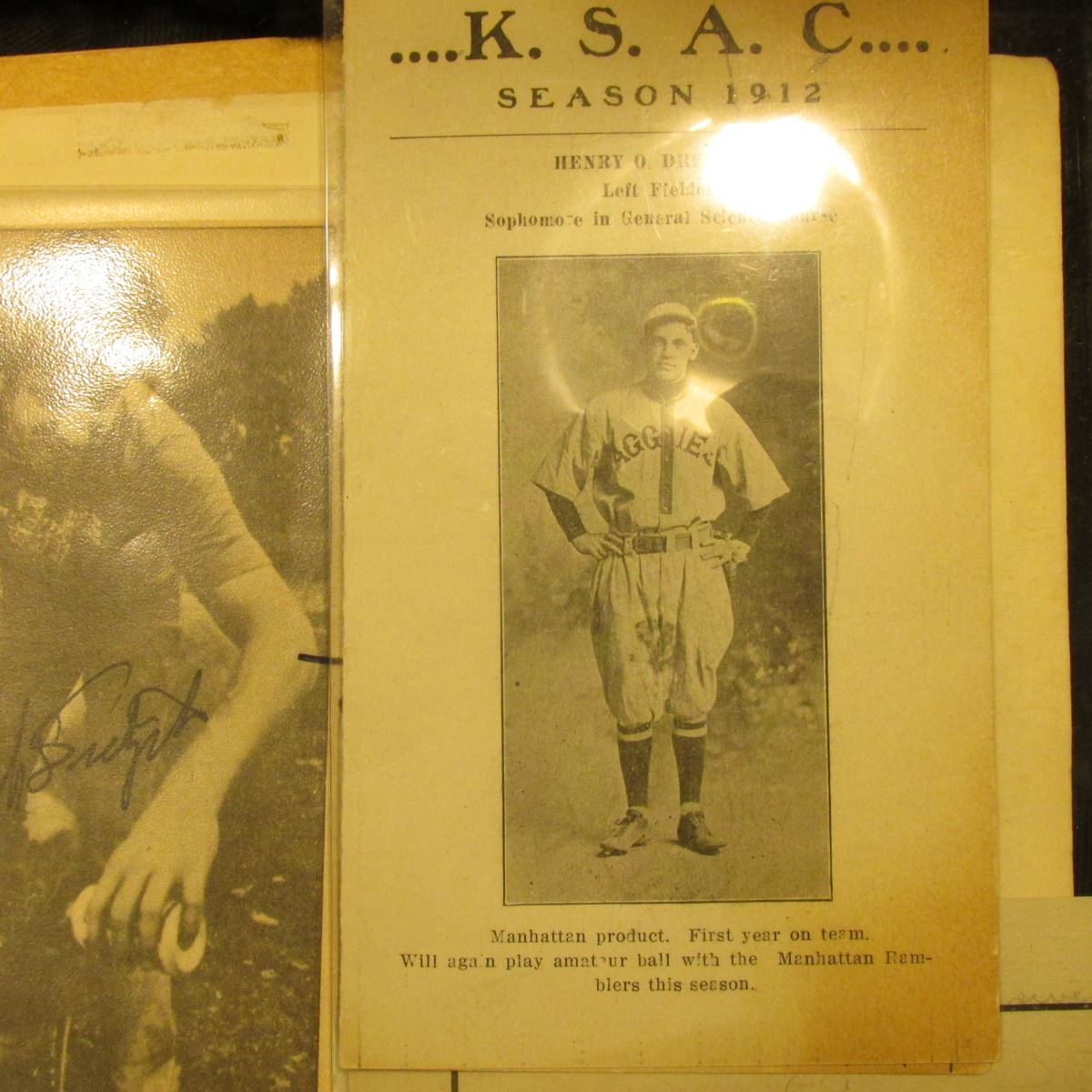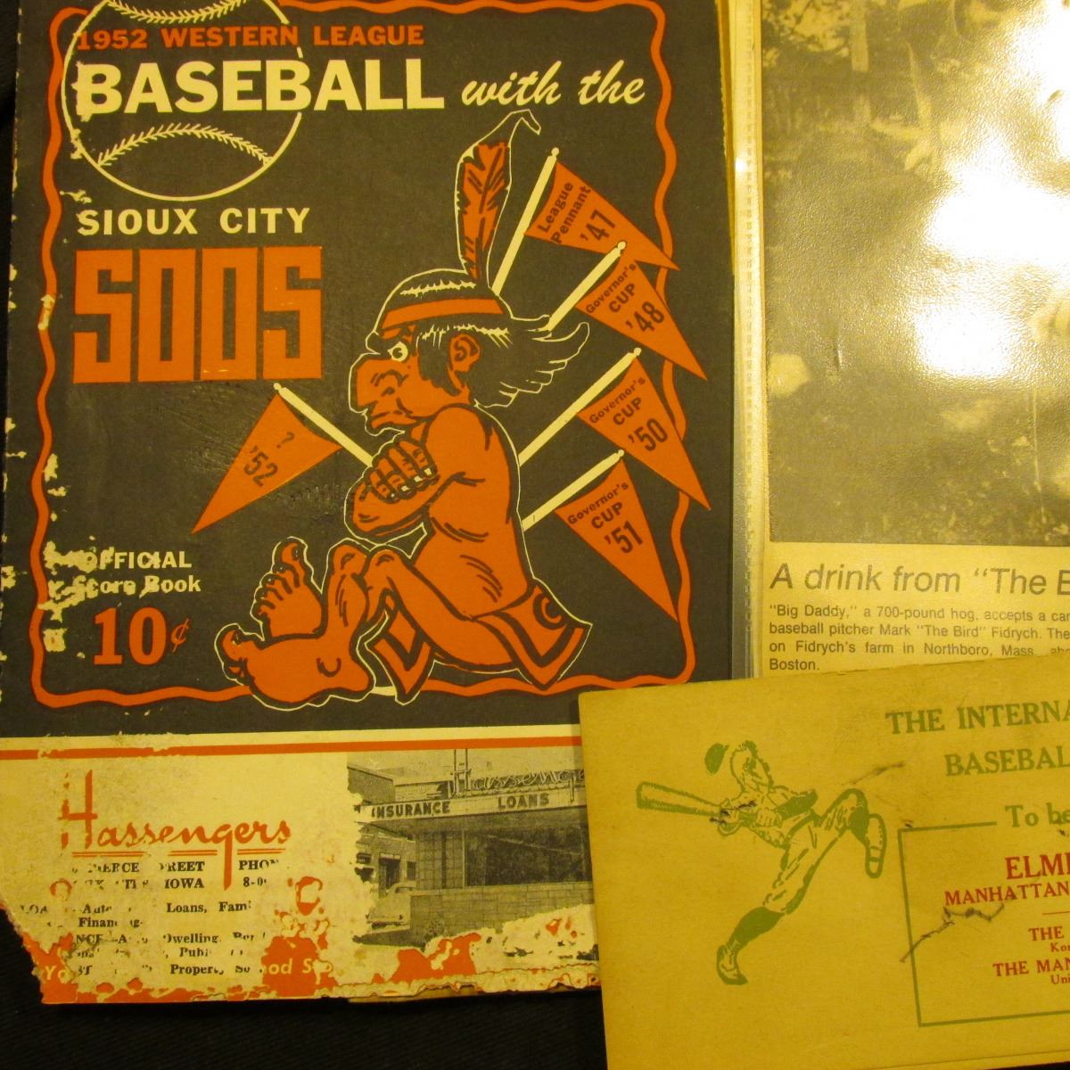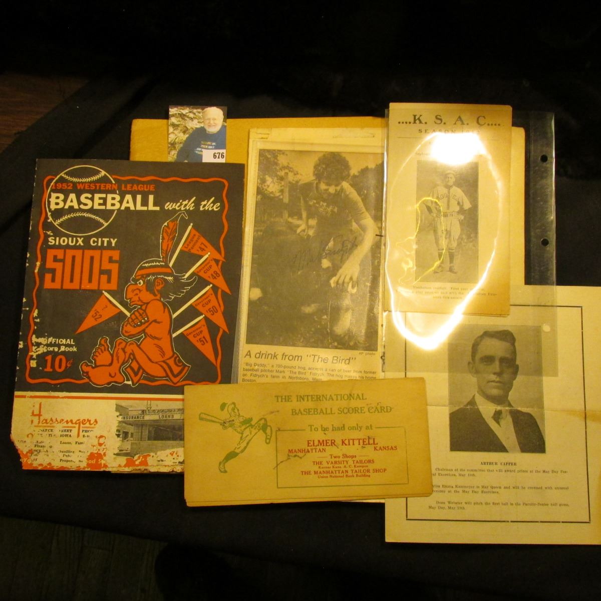Magazine article 1927 Yankees; autographed Newspaper photo of Mark "The Bird" Fidrych with a 700 pound hog; "The International Baseball Score Card To be had only at Elmer Kittell Manhattan - - Kansas"; "Arthur Capper" Scorecard; "….K.S.A.C….Season 1912 Henry O. Dresser" Baseball Score card Manhattan Product"; & 1952 Western League Baseball with the Sioux City Soos"advertising scorecard.
