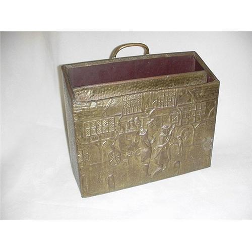 Hammered brass 2 section magazine rack. 15"long x 5 1/2" wide x 12 1/2" tall. Made in England.