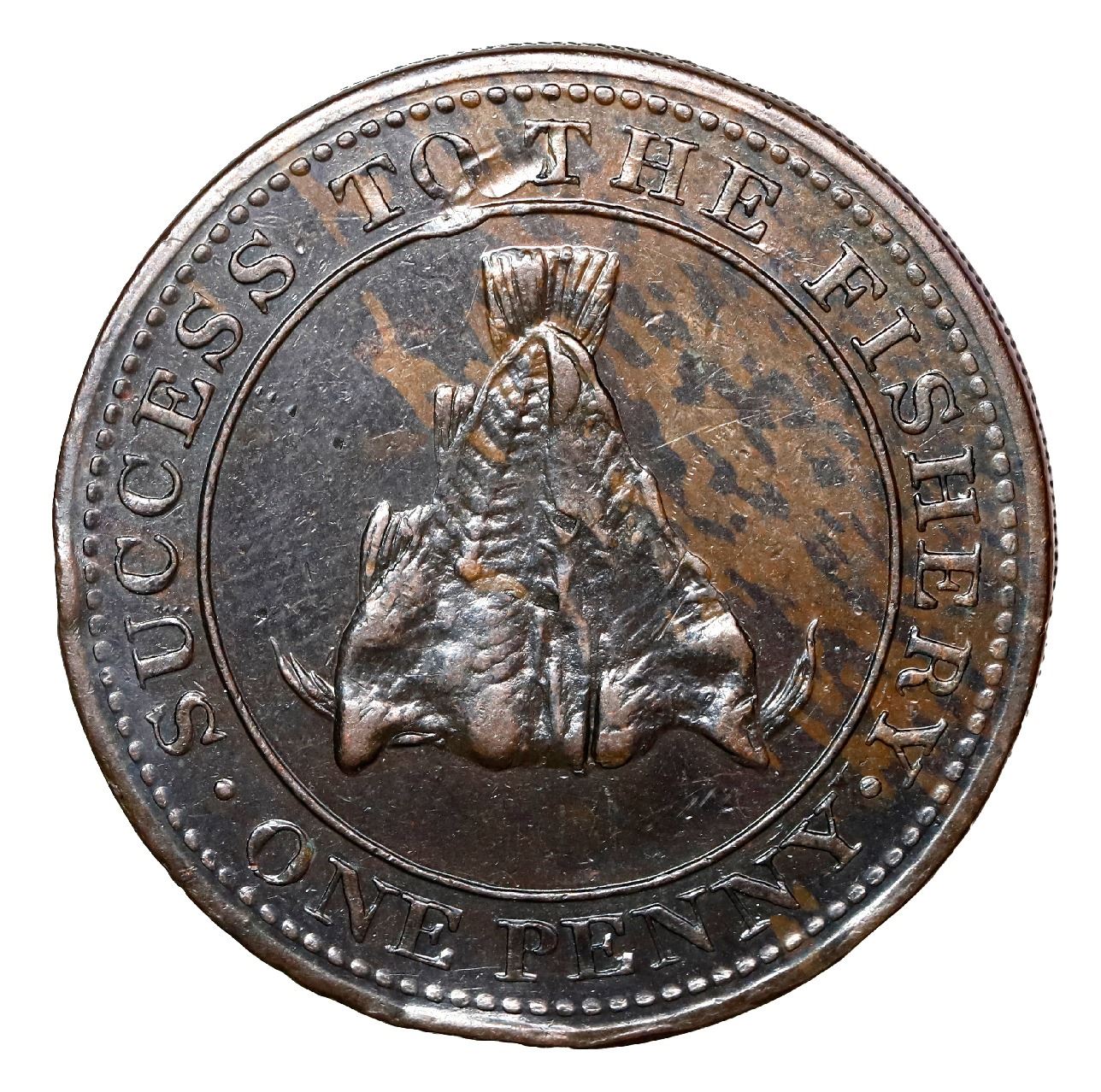 Magdalen Island, Lower Canada (struck in England), copper "seal" 1 penny token, 1815, struck from Proof dies, ex-Baker. Breton-520; KM-Tn1; LC-1. 17.14 grams. Dark XF+ with minor edge-bruises and small divot between TO and THE on reverse, somewhat glossy fields as expected for Proof dies (perhaps what Charlton refers to with the statement "a specimen exists" for variation 2). This popular type, with denomination explicit as ONE PENNY, was commissioned by Admiral Sir Isaac Coffin, who received the Magdalen Islands (west of Newfoundland, now part of Quebec) by King George III for his loyalty in the American Revolution. Its distinctive design of a seal on obverse and codfish filet on reverse succinctly embodies Lower Canada's chief maritime products. These pieces were made by Edward Thomason of London, who wrote the following in his 1845 memoir: “I had manufactured this year (1815) a large quantity of tokens for Admiral Sir Isaac Coffin, Bart., who is the sole possessor and king, as he called himself, of the Magdalen Islands, situated in the Gulf of St. Lawrence, in North America... As soon as a large quantity of these were struck off, Sir Isaac sailed off with them, packed in casks, and took with him a powerful coining press and machinery, and the dies ready engraved, to establish what he called a little mint for his subjects, to manufacture their coin for the future.” Pedigreed to the Warren Baker Collection of Canadian coins and tokens.