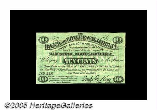 <B>Magdalena, CA- The Bank of Lower California Trust & Loan Assn.</B></I> 10¢<BR>A high grade example from this "bank" payable in gold coin at the company's offices in New York & San Francisco. It's printed on green paper with a nice engraved reverse. <B>About Uncirculated.</B></I>