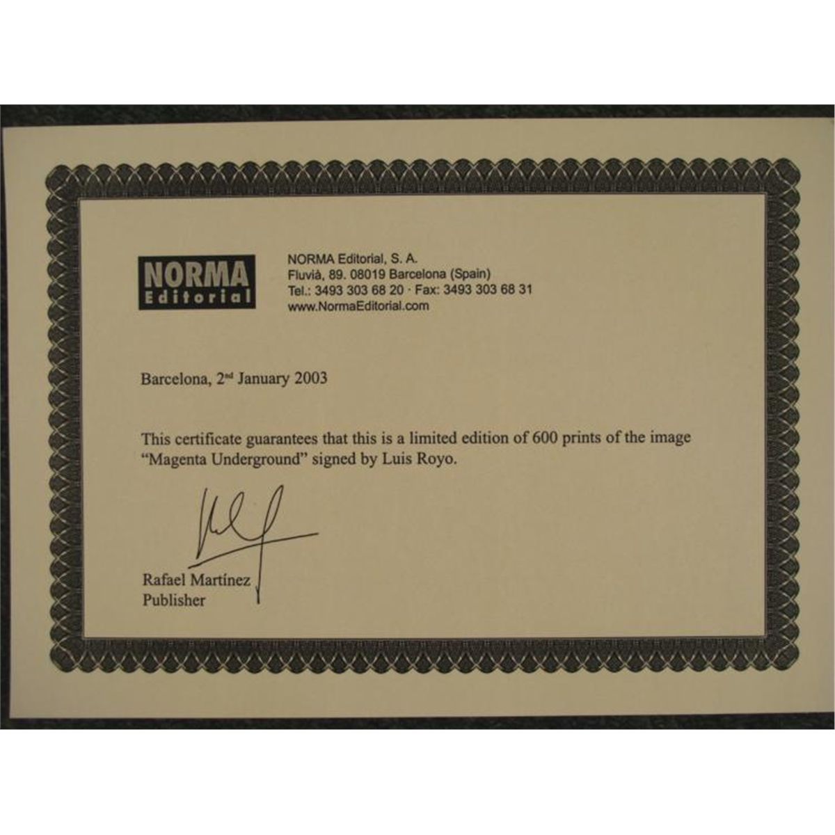 This print portrays a steam punk warrior. * Artist: Luis RoyoSignature: In pencil, lower rightTitle: Magenta Underground * Medium: Print on paperEdition: Numbered out of 600 * Sheet Size: 25" x 32 1/2"Condition: ExcellentCertificate of Authenticity from Norma Editorial *