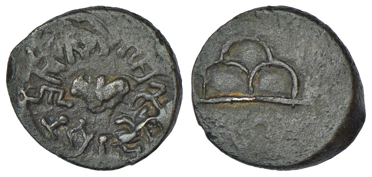 Maghas in Central India/Chattisgarh, potin unit of Vasishthiputra Arjuna (c.200-250 AD), unreported in any catalogue and unique so far, 4.42g. Obv: seated Nandi in centre; Brahmi legend from 6 o'clock Rajño Vasishthiputrasya Arjunasya anticlockwise around. Rev: three-arched hill.