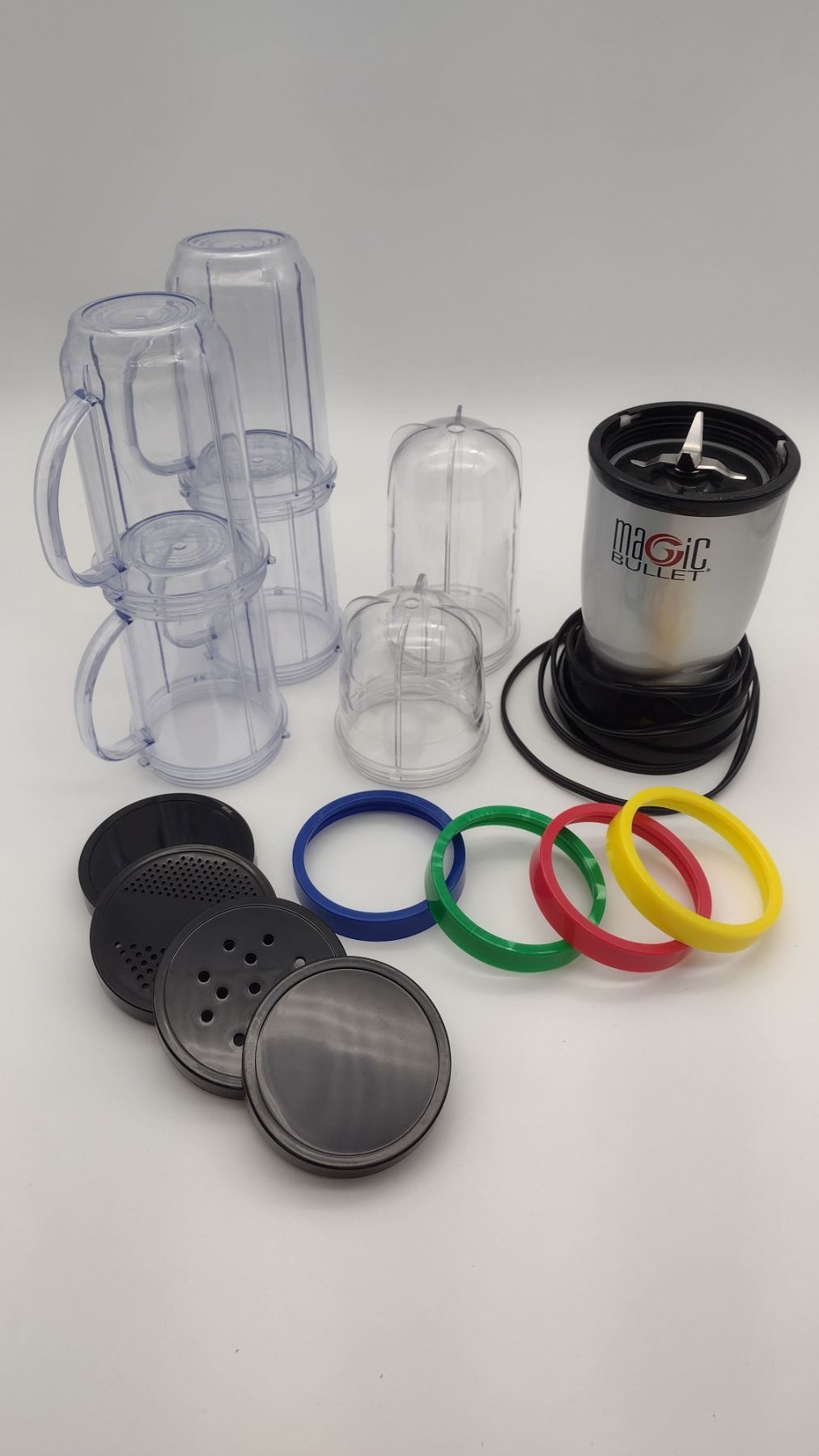includes 6 cups, blender base, 4 color rings, and covers