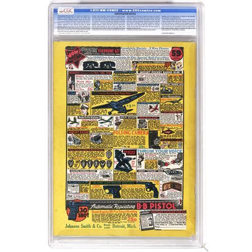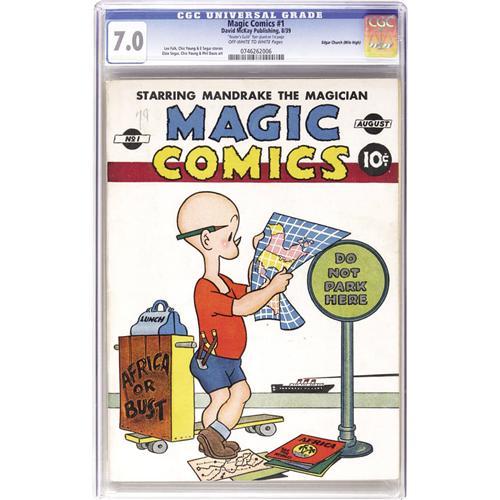 <B>Magic Comics #1 Mile High pedigree (David McKay Publications, 1939) CGC FN/VF 7.0 Off-white to white pages.</B></I> This first issue is rated "scarce"by Gerber. Amazing as it seems today, Mandrake and Blondie didn't get a cover appearance, taking a back seat to none other than... Henry! CGC notes, "'Reader's Guild' flyer glued on 1st page." Overstreet 2006 FN 6.0 value = $1,035; VF 8.0 value = $1,898. CGC census 6/06: 1 in 7.0, 2 higher. <BR><BR><B>Important notice:</B> Heritage usually auctions material at the rate of 200-250 lots per hour. On some occasions eBay Live bid software or the Internet may not be able to keep up with the pace of the auction. We recommend placing a realistic absentee bid now as insurance to avoid disappointment. Occasionally the auctioneer may eliminate or reject an eBay Live bid, and the auctioneer may also reopen a lot after the close of the eBay live bidding (usually because we missed an audience bid), and may reject your bid even if it shows you as the winning bidder. By bidding via eBay Live, you agree that Heritage may award the lot to another bidder at its sole discretion under the circumstances described above or any other reasonable circumstances. Since eBay bids are not shown to us until we open the lot on the floor, we treat those bids just like floor bids. In most cases the floor responds before the eBay bid is presented to us, due to Internet lag time, so for consistency we have made it a policy that floor bids are always considered first over tie eBay live bids. Also please note that all Heritage lots purchased through eBay Live carry a 22.5% Buyer's Premium. Please make sure you read the Terms and Conditions before you bid. This lot is being auctioned in conjunction with a live floor auction by Heritage Auction Galleries. All final auction and invoice information will be supplied by Heritage Auction Galleries, and all other information should be considered preliminary. Lot:41001 <BR><BR><B>Winning Notification and Billing:</B> After the FINAL session in this auction is complete, Heritage will send e-mail and snail mail invoices. This process normally takes several days. All final auction and invoice information will be supplied by Heritage Auction Galleries, and all other information should be considered preliminary. <BR><BR>This auction will be conducted on a live auction floor and over the Internet through eBay Live. If you choose to place an absentee bid, please take a moment to <font color='#0000ff'><u><a href='http://pages.ebay.com/liveauctions/help/before/laabsentee.html'>learn how eBay Live absentee bidding works</a></u></font><font color='#000000'>