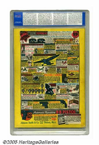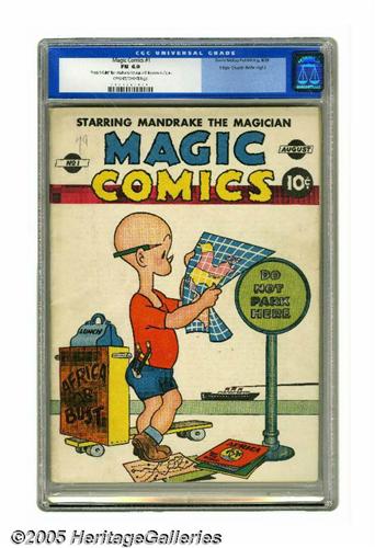 <B>Magic Comics #1 Mile High pedigree (David McKay Publications, 1939) CGC FN 6.0 Off-white to white pages.</B></I> Just two unrestored copies of this premiere issue have been certified by CGC to date - no surprise, since Gerber rates it "scarce". CGC notes, "'Reader's Guild' flyer attached to 1st page with tiny amount of glue." This was so minor that CGC still sanctioned a blue "Universal" label. Overstreet 2005 FN 6.0 value = $1,029. CGC census 7/05: 1 in 6.0, 1 higher.