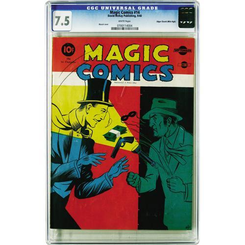 <B>Magic Comics #14 Mile High pedigree (David McKay Publications, 1940) CGC VF- 7.5 White pages.</B></I> Mandrake the Magician gave this title its name, and he's among many characters featured inside the book. The cover is by Joe Musial. Overstreet 2006 VF 8.0 value = $215. CGC census 1/06: 1 in 7.5, none higher.