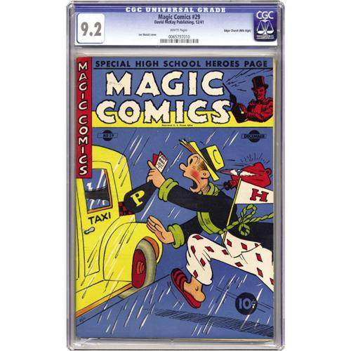 <B>Magic Comics #29 Mile High pedigree (David McKay Publications, 1941) CGC NM- 9.2 White pages.</B></I> This cover's a great period piece, reminding us that the Golden Age of comics was also a golden age for college football, taxicabs, and lots of other things! Note that a small plastic stabilizing peg is loose inside the CGC holder, not affecting the comic itself or the integrity of the holder. Overstreet 2006 NM- 9.2 value = $275. CGC census 6/06: 1 in 9.2, none higher. <BR><BR><B>Important notice:</B> Heritage usually auctions material at the rate of 200-250 lots per hour. On some occasions eBay Live bid software or the Internet may not be able to keep up with the pace of the auction. We recommend placing a realistic absentee bid now as insurance to avoid disappointment. Occasionally the auctioneer may eliminate or reject an eBay Live bid, and the auctioneer may also reopen a lot after the close of the eBay live bidding (usually because we missed an audience bid), and may reject your bid even if it shows you as the winning bidder. By bidding via eBay Live, you agree that Heritage may award the lot to another bidder at its sole discretion under the circumstances described above or any other reasonable circumstances. Since eBay bids are not shown to us until we open the lot on the floor, we treat those bids just like floor bids. In most cases the floor responds before the eBay bid is presented to us, due to Internet lag time, so for consistency we have made it a policy that floor bids are always considered first over tie eBay live bids. Also please note that all Heritage lots purchased through eBay Live carry a 22.5% Buyer's Premium. Please make sure you read the Terms and Conditions before you bid. This lot is being auctioned in conjunction with a live floor auction by Heritage Auction Galleries. All final auction and invoice information will be supplied by Heritage Auction Galleries, and all other information should be considered preliminary. Lot:41001 <BR><BR><B>Winning Notification and Billing:</B> After the FINAL session in this auction is complete, Heritage will send e-mail and snail mail invoices. This process normally takes several days. All final auction and invoice information will be supplied by Heritage Auction Galleries, and all other information should be considered preliminary. <BR><BR>This auction will be conducted on a live auction floor and over the Internet through eBay Live. If you choose to place an absentee bid, please take a moment to <font color='#0000ff'><u><a href='http://pages.ebay.com/liveauctions/help/before/laabsentee.html'>learn how eBay Live absentee bidding works</a></u></font><font color='#000000'>