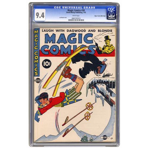 <B>Magic Comics #30 Mile High pedigree (David McKay Publications, 1942) CGC NM 9.4 White pages.</B></I> Blondie and Mandrake star. Overstreet 2006 NM- 9.2 value = $275. CGC census 4/06: 1 in 9.4, none higher.