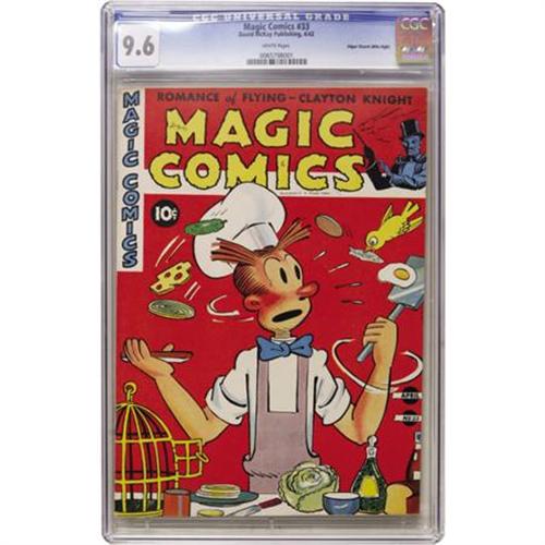 <B>Magic Comics #33 Mile High pedigree (David McKay Publications, 1942) CGC NM+ 9.6 White pages.</B></I> In addition to the sandwich-loving Dagwood and his better half Blondie, the adventures of Mandrake and a host of other strip reprints were included here. This Edgar Church copy is absolutely pristine. Overstreet 2007 NM- 9.2 value = $215. CGC census 6/07: 1 in 9.6, none higher.<BR><BR><b>Shipping:</b> Comics - Slabbed (certified) (<a target="_blank" href="http://www.heritageauctions.com/common/shipping.php">view shipping information</a>)