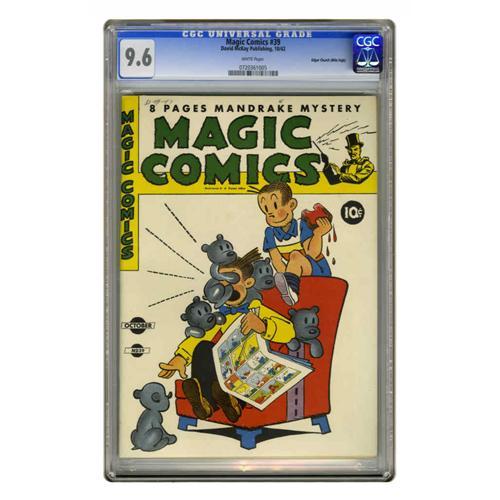 <B>Magic Comics #39 Mile High pedigree (David McKay Publications, 1942) CGC NM+ 9.6 White pages.</B></I> A Golden Age book with a white cover in 9.6 condition? <I>Has</B></I> to be a Mile High! In addition to the Blondie feature, Mandrake the Magician appears. This is the only copy of this issue that CGC has certified to date. Overstreet 2005 NM- 9.2 value = $190. CGC census 12/05: 1 in 9.6, none higher.