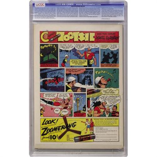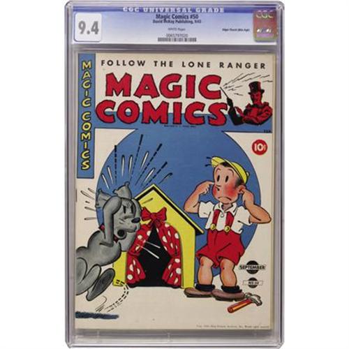 <B>Magic Comics #50 Mile High pedigree (David McKay Publications, 1943) CGC NM 9.4 White pages.</B></I> While "Blondie" the feature was one of this series' mainstays, Blondie the <I>character</B></I> only ever made one cover. Here, she stepped aside in favor of Alexander and Daisy. The other King Features stars inside include the Lone Ranger and Mandrake. Overstreet 2007 NM- 9.2 value = $165. CGC census 6/07: 1 in 9.4, none higher.<BR><BR><b>Shipping:</b> Comics - Slabbed (certified) (<a target="_blank" href="http://www.heritageauctions.com/common/shipping.php">view shipping information</a>)