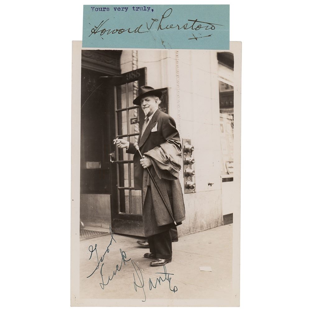 Two items: an ink signature, “Howard Thurston,” on a blue 4 x 1.25 slip clipped from the close of a letter; and a vintage glossy 4.5 x 7.25 full-length photo of magician Harry August Jansen, signed in fountain pen, “Good luck, Dante.” In overall fine condition.