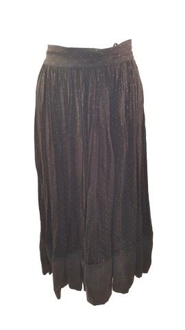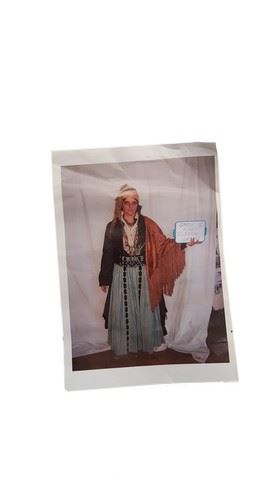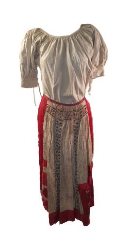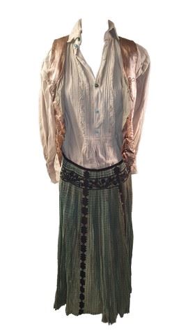 Screen worn set of layered skirts and blouses. Includes one shiney golden colored vest, a white blouse with blue buttons, a white truffled blouse, a green and black patterned skirt, a red and cream patterned skirt and a black colored skirt with white squares.