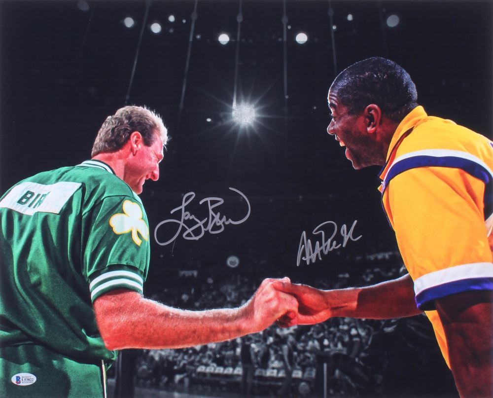 Photo measures 16" x 20" in size and has been hand signed in silver paint pen by Magic Johnson (Los Angeles Lakers, HOF) and Larry Bird (Boston Celtics, HOF).