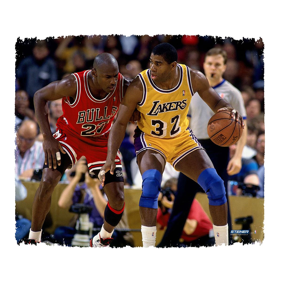 Magic Johnson Posting Up Michael Jordan Red Jersey 20x24 Canvas Uns (Getty #74171098)