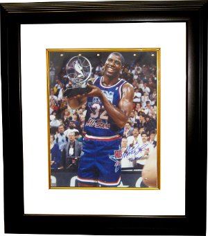 Magic Johnson was selected first overall in the 1979 NBA Draft by the Lakers. He won a championship and an NBA Finals Most Valuable Player Award in his rookie season, and won four more championships with the Lakers during the 1980s. Johnson retired abruptly in 1991 after announcing that he had HIV, but returned to play in the 1992 All-Star Game, winning the All-Star MVP Award. Magic has hand autographed this 1992 All Star 16x20 Photo with 92 MVP inscription. Limited Edition of 132! White Mat and Black Color Framed as shown. SSG Hologram and Certificate of Authenticity from Athlon Sports.