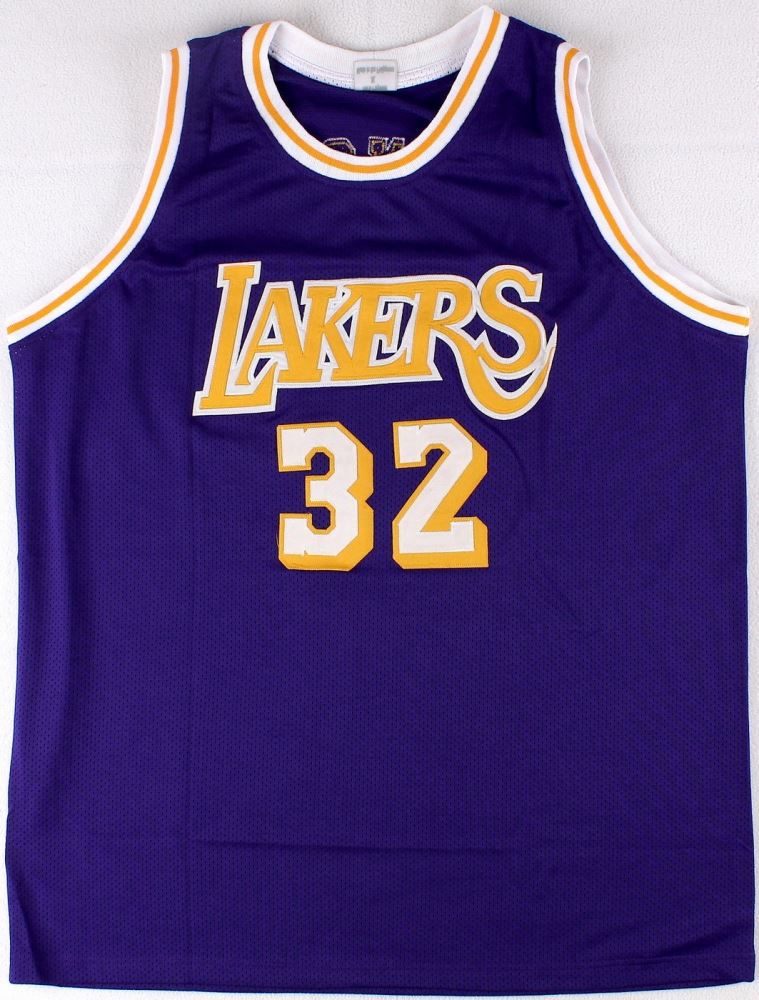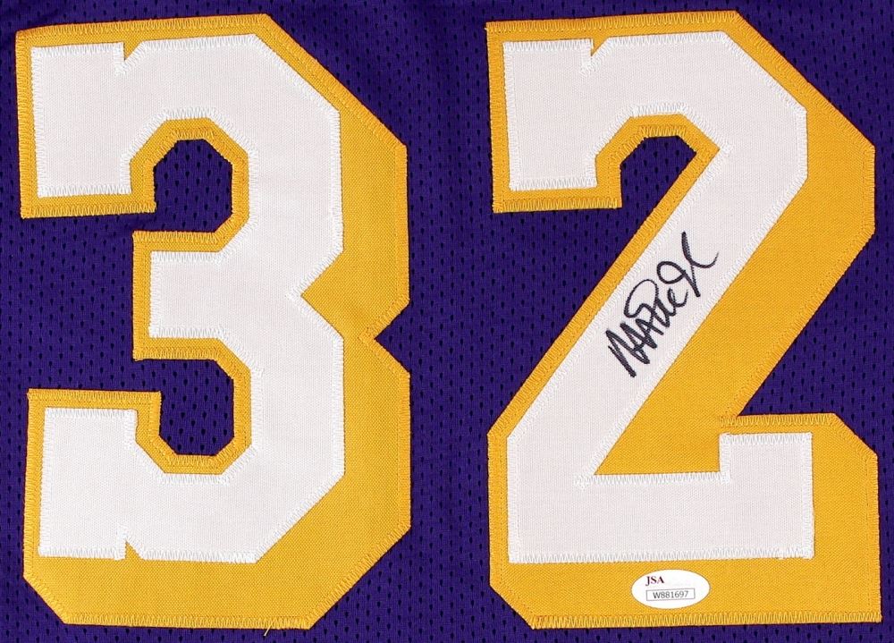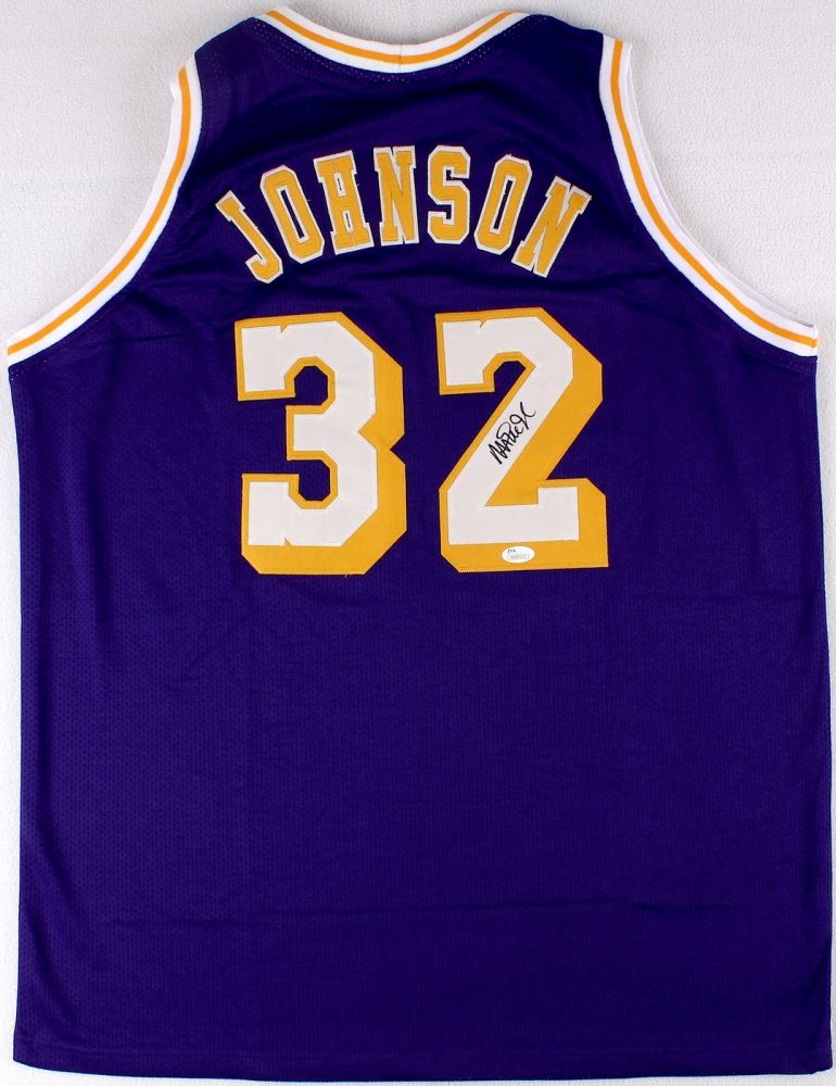 Custom on-court style jersey. Everything is sewn on, size XL. Hand-signed in black felt-tip pen by Magic Johnson (Lakers HOF).