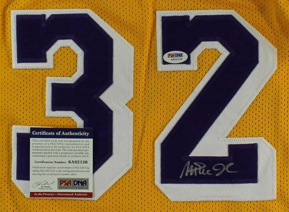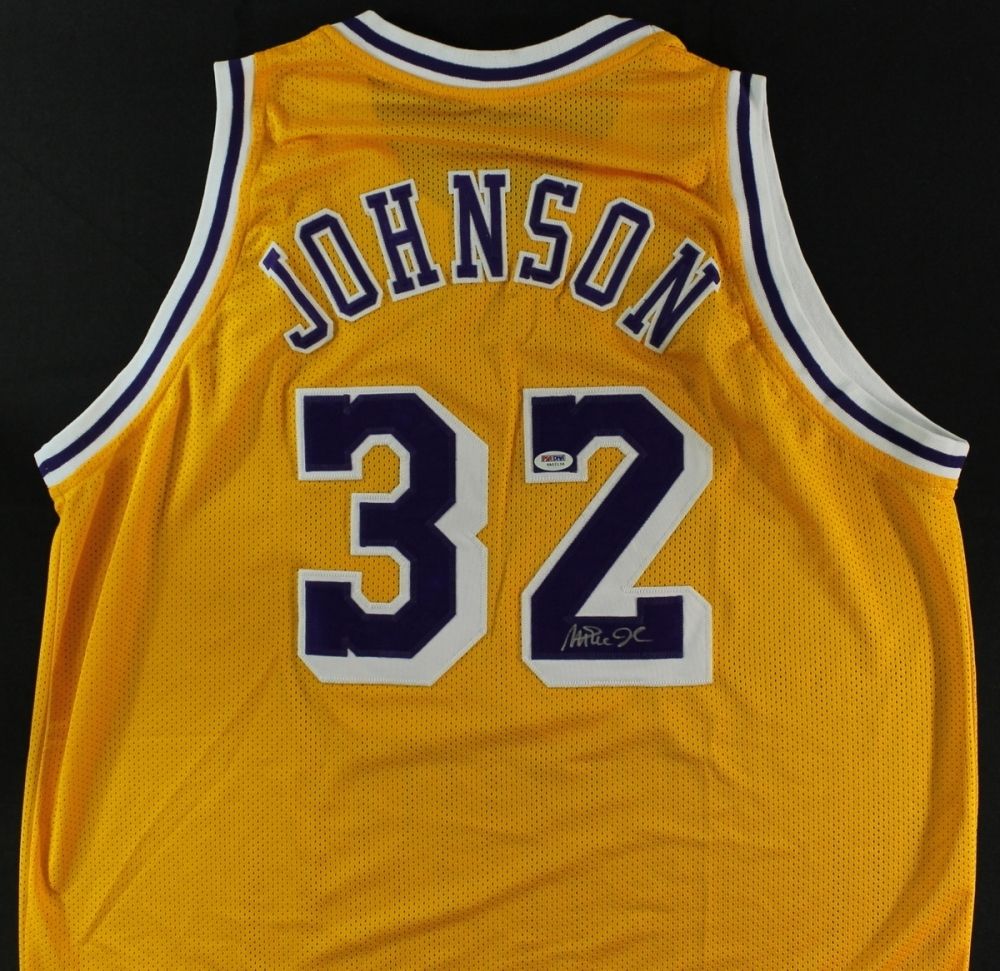 Custom on-court style jersey. Everything sewn on, size XL. Hand-signed in silver paint pen by Magic Johnson (Lakers HOF).