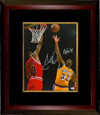 Magic Johnson was selected first overall in the 1979 NBA Draft by the Lakers. He won a championship and an NBA Finals Most Valuable Player Award in his rookie season, and won four more championships with the Lakers during the 1980s. Johnson's career achievements include three NBA MVP Awards, nine NBA Finals appearances, twelve All-Star games, and ten All-NBA First and Second Team nominations. Scottie Pippen, along with Michael Jordan, played an important role in transforming the Bulls team into a vehicle for popularizing the NBA around the world during the 1990s. Considered one of the best small forwards of all time, Pippen was named to the NBA All-Defensive First Team eight times and the All-NBA First Team three times. He was a seven-time NBA All Star and was the NBA All-Star Game MVP in 1994. He was named one of the 50 Greatest Players in NBA History during the 1996–97 season, and is one of four players to have his jersey retired by the Chicago Bulls.Magic Johnson and Scottie Pippen have hand signed this Los Angeles Lakers/Chicago Bulls 16x20 Photo. PSA Hologram and Certificate of Authenticity. Custom Black Mat and Mahogany Framed as shown.