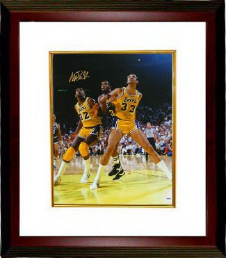 Magic Johnson was selected first overall in the 1979 NBA Draft by the Lakers. He won a championship and an NBA Finals Most Valuable Player Award in his rookie season, and won four more championships with the Lakers during the 1980s. Johnson's career achievements include three NBA MVP Awards, nine NBA Finals appearances, twelve All-Star games, and ten All-NBA First and Second Team nominations. He led the league in regular-season assists four times, and is the NBA's all-time leader in assists per game, with an average of 11.2. Johnson was a member of the "Dream Team", the U.S. basketball team that won the Olympic gold medal in 1992. Magic Johnson has hand signed this Los Angeles Lakers 16x20 Photo (vs Kareem Abdul-Jabbar). PSA Hologram and Certificate of Authenticity. Custom White Mat and Premium Mahogany Frame as shown.