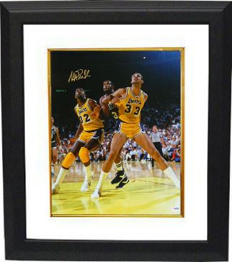 Magic Johnson was selected first overall in the 1979 NBA Draft by the Lakers. He won a championship and an NBA Finals Most Valuable Player Award in his rookie season, and won four more championships with the Lakers during the 1980s. Johnson's career achievements include three NBA MVP Awards, nine NBA Finals appearances, twelve All-Star games, and ten All-NBA First and Second Team nominations. He led the league in regular-season assists four times, and is the NBA's all-time leader in assists per game, with an average of 11.2. Johnson was a member of the "Dream Team", the U.S. basketball team that won the Olympic gold medal in 1992. Magic Johnson has hand signed this Los Angeles Lakers 16x20 Photo (vs Kareem Abdul-Jabbar). PSA Hologram and Certificate of Authenticity. Custom White Mat and Premium Black Frame as shown.