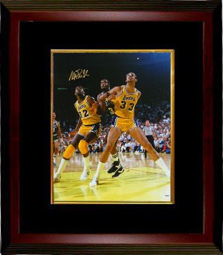 Magic Johnson was selected first overall in the 1979 NBA Draft by the Lakers. He won a championship and an NBA Finals Most Valuable Player Award in his rookie season, and won four more championships with the Lakers during the 1980s. Johnson's career achievements include three NBA MVP Awards, nine NBA Finals appearances, twelve All-Star games, and ten All-NBA First and Second Team nominations. He led the league in regular-season assists four times, and is the NBA's all-time leader in assists per game, with an average of 11.2. Johnson was a member of the "Dream Team", the U.S. basketball team that won the Olympic gold medal in 1992. Magic Johnson has hand signed this Los Angeles Lakers 16x20 Photo (vs Kareem Abdul-Jabbar). PSA Hologram and Certificate of Authenticity. Custom Black Mat and Premium Mahogany Frame as shown.
