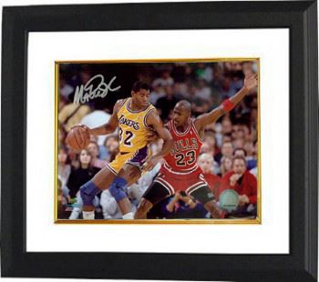 Magic Johnson was selected first overall in the 1979 NBA Draft by the Lakers. He won a championship and an NBA Finals Most Valuable Player Award in his rookie season, and won four more championships with the Lakers during the 1980s. Johnson's career achievements include three NBA MVP Awards, nine NBA Finals appearances, twelve All-Star games, and ten All-NBA First and Second Team nominations. He led the league in regular-season assists four times, and is the NBA's all-time leader in assists per game, with an average of 11.2. Johnson was a member of the "Dream Team", the U.S. basketball team that won the Olympic gold medal in 1992. Magic Johnson has hand signed this Los Angeles Lakers 16x20 Photo (yellow jersey post up horizontal vs Michael Jordan). Certificate of Authenticity from Athlon Sports. Custom White Mat and Premium Black Color Framed as shown.