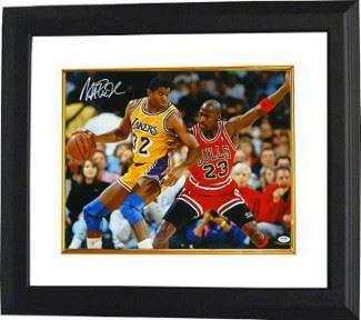 Magic Johnson was selected first overall in the 1979 NBA Draft by the Lakers. He won a championship and an NBA Finals Most Valuable Player Award in his rookie season, and won four more championships with the Lakers during the 1980s. Johnson's career achievements include three NBA MVP Awards, nine NBA Finals appearances, twelve All-Star games, and ten All-NBA First and Second Team nominations. He led the league in regular-season assists four times, and is the NBA's all-time leader in assists per game, with an average of 11.2. Johnson was a member of the "Dream Team", the U.S. basketball team that won the Olympic gold medal in 1992. Magic Johnson has hand signed this Los Angeles Lakers 16x20 Photo (yellow jersey post up horizontal vs Michael Jordan). PSA Hologram and Certificate of Authenticity. Custom White Mat and Premium Black Frame as shown.