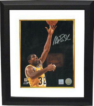 Magic Johnson was selected first overall in the 1979 NBA Draft by the Lakers. He won a championship and an NBA Finals Most Valuable Player Award in his rookie season, and won four more championships with the Lakers during the 1980s. Johnson's career achievements include three NBA MVP Awards, nine NBA Finals appearances, twelve All-Star games, and ten All-NBA First and Second Team nominations. He led the league in regular-season assists four times, and is the NBA's all-time leader in assists per game, with an average of 11.2. Johnson was a member of the "Dream Team", the U.S. basketball team that won the Olympic gold medal in 1992. Magic Johnson has hand signed this Los Angeles Lakers 16x20 Photo. Photo of the Signing and Super Star Greetings Hologram and Certificate of Authenticity. Custom White Mat and Premium Black Frame as shown.