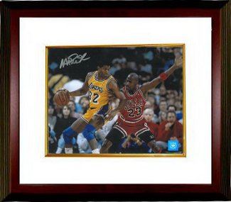 Magic Johnson was selected first overall in the 1979 NBA Draft by the Lakers. He won a championship and an NBA Finals Most Valuable Player Award in his rookie season, and won four more championships with the Lakers during the 1980s. Johnson's career achievements include three NBA MVP Awards, nine NBA Finals appearances, twelve All-Star games, and ten All-NBA First and Second Team nominations. He led the league in regular-season assists four times, and is the NBA's all-time leader in assists per game, with an average of 11.2. Johnson was a member of the "Dream Team", the U.S. basketball team that won the Olympic gold medal in 1992. Magic Johnson has hand signed this Los Angeles Lakers 16X20 Photo vs Michael Jordan. Photo of the Signing and Super Star Greetings Hologram and Certificate of Authenticity. Custom White Mat and Premium Mahogany Frame as shown.