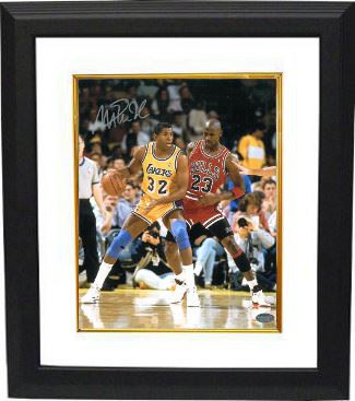 Magic Johnson was selected first overall in the 1979 NBA Draft by the Lakers. He won a championship and an NBA Finals Most Valuable Player Award in his rookie season, and won four more championships with the Lakers during the 1980s. Johnson's career achievements include three NBA MVP Awards, nine NBA Finals appearances, twelve All-Star games, and ten All-NBA First and Second Team nominations. He led the league in regular-season assists four times, and is the NBA's all-time leader in assists per game, with an average of 11.2. Johnson was a member of the "Dream Team", the U.S. basketball team that won the Olympic gold medal in 1992. Magic Johnson has hand signed this Los Angeles Lakers 16x20 Photo vs Michael Jordan. Schwartz Sports Hologram and Certificate of Authenticity from Athlon Sports. Custom White Mat and Premium Black Color Framed as shown.