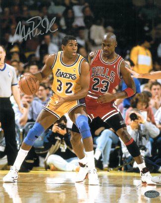 Magic Johnson was selected first overall in the 1979 NBA Draft by the Lakers. He won a championship and an NBA Finals Most Valuable Player Award in his rookie season, and won four more championships with the Lakers during the 1980s. Johnson's career achievements include three NBA MVP Awards, nine NBA Finals appearances, twelve All-Star games, and ten All-NBA First and Second Team nominations. He led the league in regular-season assists four times, and is the NBA's all-time leader in assists per game, with an average of 11.2. Johnson was a member of the "Dream Team", the U.S. basketball team that won the Olympic gold medal in 1992. Magic Johnson has hand signed this Los Angeles Lakers 16x20 Photo vs Michael Jordan. Schwartz Sports Hologram and Certificate of Authenticity from Athlon Sports.