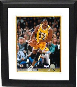 Magic Johnson was selected first overall in the 1979 NBA Draft by the Lakers. He won a championship and an NBA Finals Most Valuable Player Award in his rookie season, and won four more championships with the Lakers during the 1980s. Johnson's career achievements include three NBA MVP Awards, nine NBA Finals appearances, twelve All-Star games, and ten All-NBA First and Second Team nominations. He led the league in regular-season assists four times, and is the NBA's all-time leader in assists per game, with an average of 11.2. Johnson was a member of the "Dream Team", the U.S. basketball team that won the Olympic gold medal in 1992. Magic Johnson has hand signed this Los Angeles Lakers 8x10 Photo. PSA Hologram and Certificate of Authenticity. Custom White Mat and Premium Black Color Framed as shown.