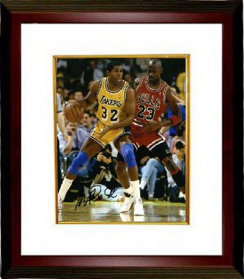 Magic Johnson was selected first overall in the 1979 NBA Draft by the Lakers. He won a championship and an NBA Finals Most Valuable Player Award in his rookie season, and won four more championships with the Lakers during the 1980s. Johnson's career achievements include three NBA MVP Awards, nine NBA Finals appearances, twelve All-Star games, and ten All-NBA First and Second Team nominations. He led the league in regular-season assists four times, and is the NBA's all-time leader in assists per game, with an average of 11.2. Johnson was a member of the "Dream Team", the U.S. basketball team that won the Olympic gold medal in 1992. Magic Johnson has hand signed this Los Angeles Lakers 8x10 Photo (yellow jersey post up vs Michael Jordan).Certificate of Authenticity from Athlon Sports. Custom White Mat and Premium Mahogany Frame as shown.