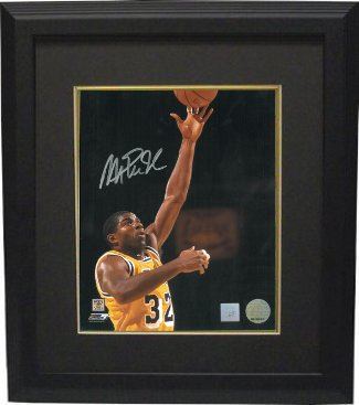 Magic Johnson was selected first overall in the 1979 NBA Draft by the Lakers. He won a championship and an NBA Finals Most Valuable Player Award in his rookie season, and won four more championships with the Lakers during the 1980s. Johnson's career achievements include three NBA MVP Awards, nine NBA Finals appearances, twelve All-Star games, and ten All-NBA First and Second Team nominations. He led the league in regular-season assists four times, and is the NBA's all-time leader in assists per game, with an average of 11.2. Johnson was a member of the "Dream Team", the U.S. basketball team that won the Olympic gold medal in 1992. Magic Johnson has hand signed this Los Angeles Lakers 8x10 Photo. Photo of the Signing and Super Star Greetings Hologram and Certificate of Authenticity. Custom Black Mat and Premium Black Frame as shown.