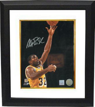Magic Johnson was selected first overall in the 1979 NBA Draft by the Lakers. He won a championship and an NBA Finals Most Valuable Player Award in his rookie season, and won four more championships with the Lakers during the 1980s. Johnson's career achievements include three NBA MVP Awards, nine NBA Finals appearances, twelve All-Star games, and ten All-NBA First and Second Team nominations. He led the league in regular-season assists four times, and is the NBA's all-time leader in assists per game, with an average of 11.2. Johnson was a member of the "Dream Team", the U.S. basketball team that won the Olympic gold medal in 1992. Magic Johnson has hand signed this Los Angeles Lakers 8x10 Photo. Photo of the Signing and Super Star Greetings Hologram and Certificate of Authenticity. Custom White Mat and Premium Black Frame as shown.