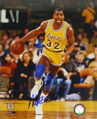 Magic Johnson was selected first overall in the 1979 NBA Draft by the Lakers. He won a championship and an NBA Finals Most Valuable Player Award in his rookie season, and won four more championships with the Lakers during the 1980s. Johnson's career achievements include three NBA MVP Awards, nine NBA Finals appearances, twelve All-Star games, and ten All-NBA First and Second Team nominations. He led the league in regular-season assists four times, and is the NBA's all-time leader in assists per game, with an average of 11.2. Johnson was a member of the "Dream Team", the U.S. basketball team that won the Olympic gold medal in 1992. Magic Johnson has hand signed this Los Angeles Lakers 8x10 Photo (yellow jersey dribble). Schwartz Sports Hologram and Certificate of Authenticity from Athlon Sports.