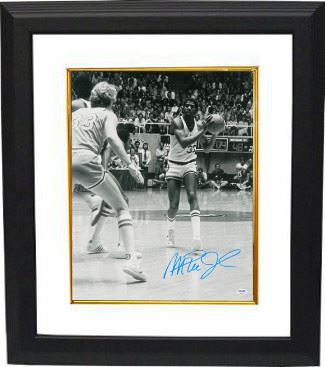 Magic Johnson averaged 17.0 points, 7.9 rebounds, and 7.4 assists per game as a freshman at Michgian State, and led the Spartans to a 25–5 record, the Big Ten Conference title, and a berth in the 1978 NCAA Tournament. The Spartans reached the Elite Eight, but lost narrowly to eventual national champion Kentucky. During the 1978–79 season, Michigan State again qualified for the NCAA Tournament, where they advanced to the championship game and faced Indiana State University, which was led by senior Larry Bird. In what was the most-watched college basketball game ever, Michigan State defeated Indiana State 75–64, and Johnson was voted Most Outstanding Player of the Final Four. Magic Johnson has hand signed this Michigan State Spartans B&W 16X20 Photo vs Larry Bird 1979 Championship Game. PSA Hologram and Certificate of Authenticity. Custom White Mat and Premium Black Frame as shown.