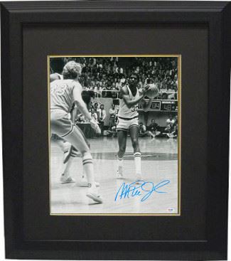 Magic Johnson averaged 17.0 points, 7.9 rebounds, and 7.4 assists per game as a freshman at Michgian State, and led the Spartans to a 25–5 record, the Big Ten Conference title, and a berth in the 1978 NCAA Tournament. The Spartans reached the Elite Eight, but lost narrowly to eventual national champion Kentucky. During the 1978–79 season, Michigan State again qualified for the NCAA Tournament, where they advanced to the championship game and faced Indiana State University, which was led by senior Larry Bird. In what was the most-watched college basketball game ever, Michigan State defeated Indiana State 75–64, and Johnson was voted Most Outstanding Player of the Final Four. Magic Johnson has hand signed this Michigan State Spartans B&W 16X20 Photo vs Larry Bird 1979 Championship Game. PSA Hologram and Certificate of Authenticity. Custom Black Mat and Premium Black Frame as shown.