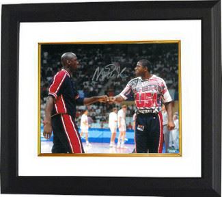 Magic Johnson was selected first overall in the 1979 NBA Draft by the Lakers. He won a championship and an NBA Finals Most Valuable Player Award in his rookie season, and won four more championships with the Lakers during the 1980s. Johnson's career achievements include three NBA MVP Awards, nine NBA Finals appearances, twelve All-Star games, and ten All-NBA First and Second Team nominations. He led the league in regular-season assists four times, and is the NBA's all-time leader in assists per game, with an average of 11.2. Johnson was a member of the "Dream Team", the U.S. basketball team that won the Olympic gold medal in 1992. Magic Johnson has hand signed this Team USA Olympic Dream Team 16x20 Photo vs Michael Jordan. Schwartz Sports Hologram and Certificate of Authenticity from Athlon Sports. Custom White Mat and Premium Black Color Framed as shown.