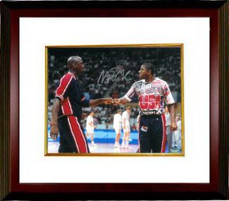Magic Johnson was selected first overall in the 1979 NBA Draft by the Lakers. He won a championship and an NBA Finals Most Valuable Player Award in his rookie season, and won four more championships with the Lakers during the 1980s. Johnson's career achievements include three NBA MVP Awards, nine NBA Finals appearances, twelve All-Star games, and ten All-NBA First and Second Team nominations. He led the league in regular-season assists four times, and is the NBA's all-time leader in assists per game, with an average of 11.2. Johnson was a member of the "Dream Team", the U.S. basketball team that won the Olympic gold medal in 1992. Magic Johnson has hand signed this Team USA Olympic Dream Team 8X10 Photo vs Michael Jordan. Schwartz Sports Hologram and Certificate of Authenticity from Athlon Sports. Custom White Mat and Premium Mahogany Color Framed as shown.