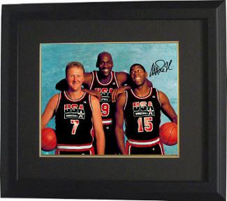 Magic Johnson was selected first overall in the 1979 NBA Draft by the Lakers. He won a championship and an NBA Finals Most Valuable Player Award in his rookie season, and won four more championships with the Lakers during the 1980s. Johnson's career achievements include three NBA MVP Awards, nine NBA Finals appearances, twelve All-Star games, and ten All-NBA First and Second Team nominations. He led the league in regular-season assists four times, and is the NBA's all-time leader in assists per game, with an average of 11.2. Johnson was a member of the "Dream Team", the U.S. basketball team that won the Olympic gold medal in 1992. Magic Johnson has hand signed this Team USA Olympic Dream Team 8X10 Photo with Larry Bird and Michael Jordan. Schwartz Sports Hologram and Certificate of Authenticity from Athlon Sports. Custom Black Mat and Premium Black Frame as shown.