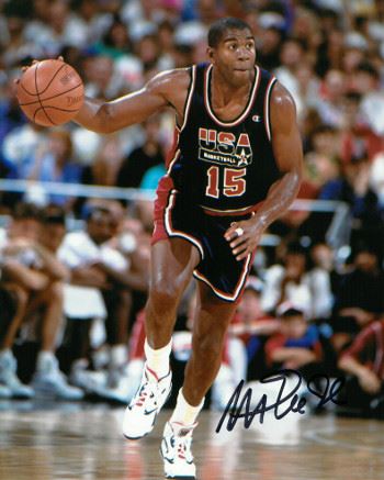 Magic Johnson was selected first overall in the 1979 NBA Draft by the Lakers. He won a championship and an NBA Finals Most Valuable Player Award in his rookie season, and won four more championships with the Lakers during the 1980s. Johnson's career achievements include three NBA MVP Awards, nine NBA Finals appearances, twelve All-Star games, and ten All-NBA First and Second Team nominations. He led the league in regular-season assists four times, and is the NBA's all-time leader in assists per game, with an average of 11.2. Johnson was a member of the "Dream Team", the U.S. basketball team that won the Olympic gold medal in 1992. Magic Johnson has hand signed this Team USA Olympic Dream Team 8X10 Photo. Certificate of Authenticity from Athlon Sports.
