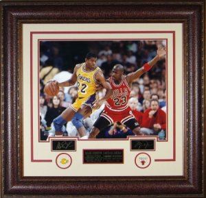 Magic Johnson was selected first overall in the 1979 NBA Draft by the Lakers. He won a championship and an NBA Finals Most Valuable Player Award in his rookie season, and won four more championships with the Lakers during the 1980s. Johnson's career achievements include three NBA MVP Awards, nine NBA Finals appearances, twelve All-Star games, and ten All-NBA First and Second Team nominations. Jordan joined the NBA's Chicago Bulls in 1984. He quickly emerged as a league star, entertaining crowds with his prolific scoring. His leaping ability, illustrated by performing slam dunks from the free throw line in slam dunk contests, earned him the nicknames "Air Jordan" and "His Airness". He also gained a reputation for being one of the best defensive players in basketball.[5] In 1991, he won his first NBA championship with the Bulls, and followed that achievement with titles in 1992 and 1993, securing a "three-peat". This is a Michael Jordan and Magic Johnson custom premium leather framed unautographed Replica Signature Engraved oversize 33x32 piece.