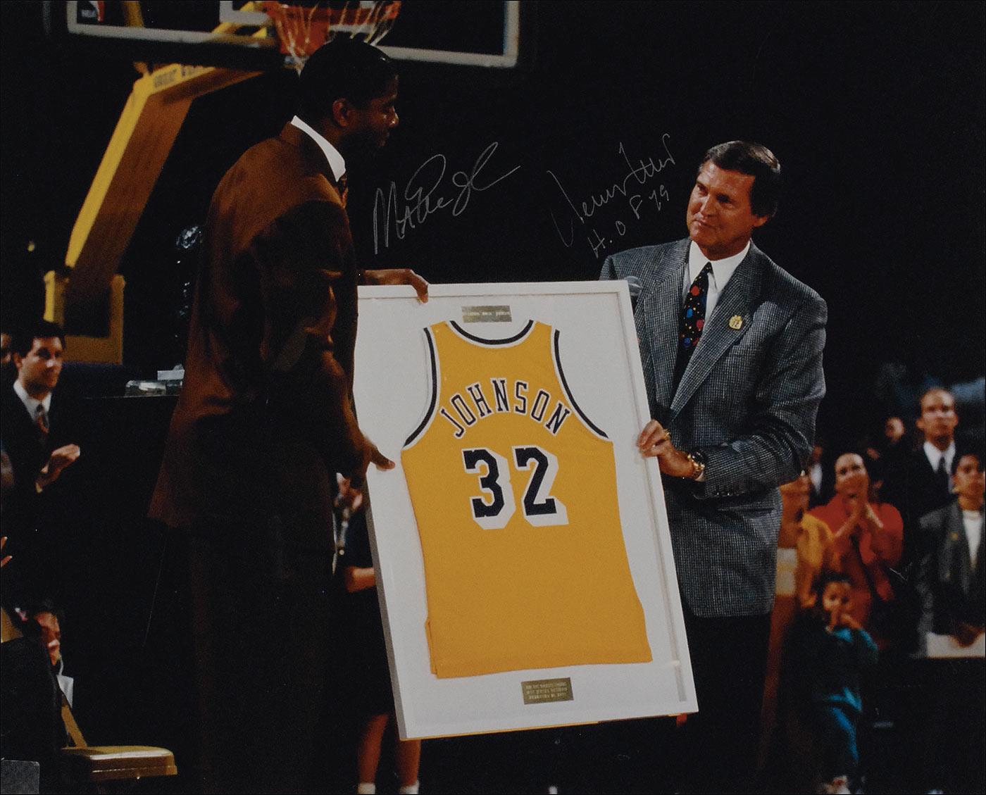 Color satin-finish 20 x 16 photo of West presenting Johnson with a Lakers jersey at his retirement ceremony, signed in silver ink by Johnson and West. Rolled and in fine condition.