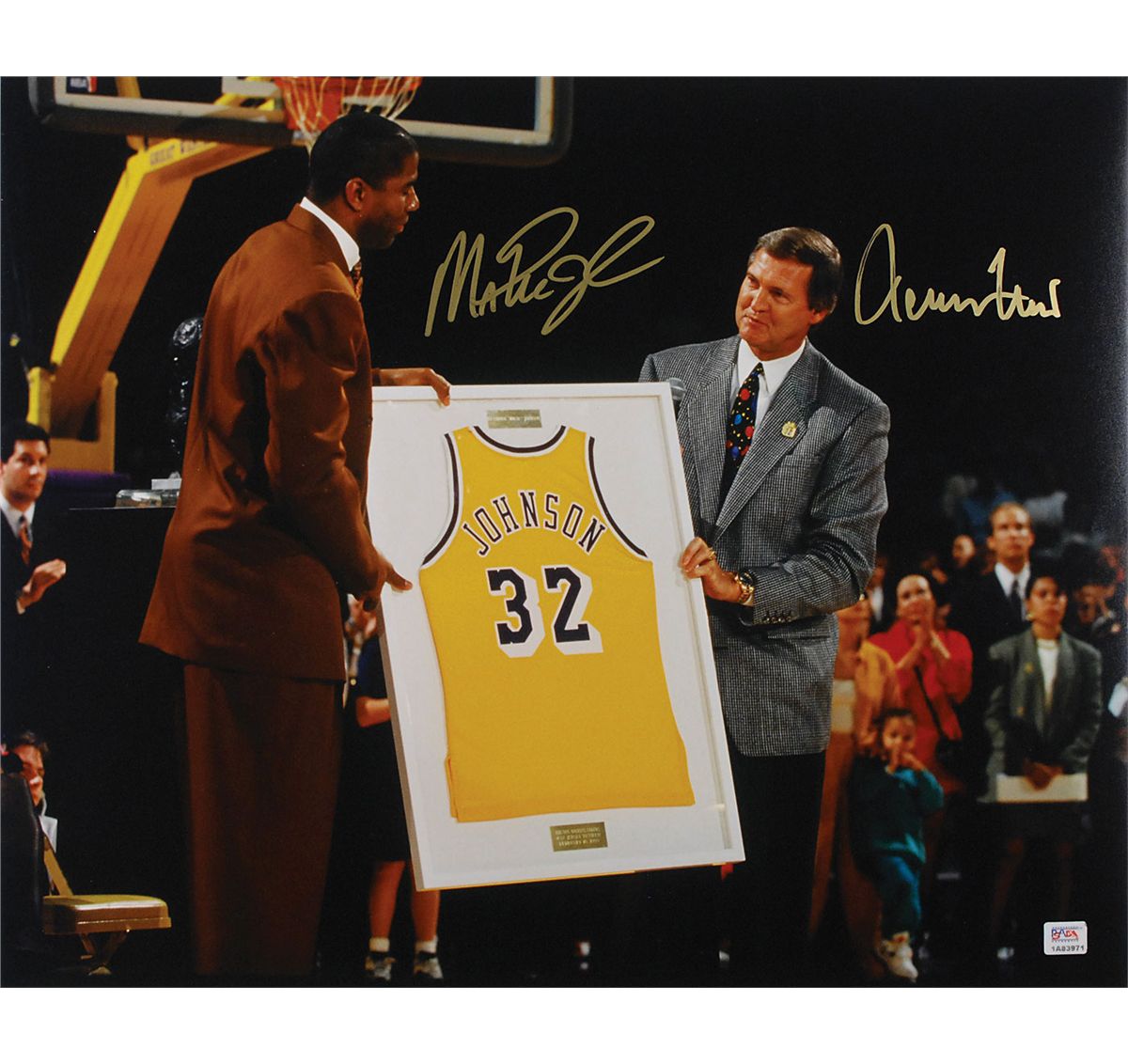Color satin-finish 20 x 16 photo of West presenting Johnson with a Lakers jersey at his retirement ceremony, signed in gold ink by Johnson and West. In fine condition, with a PSA/DNA authentication label affixed to lower corner. Accompanied by a certificate of authenticity from PSA/DNA.