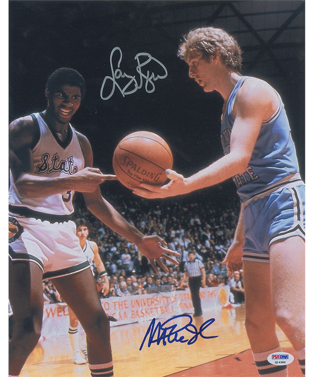 Color satin-finish 11 x 14 photo of the two from their memorable 1979 NCAA championship game, signed in silver ink by Larry Bird and in blue felt tip by Magic Johnson. In fine condition, with a PSA/DNA authentication label affixed to lower right corner.