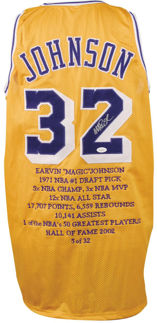 Replica Los Angeles Lakers basketball jersey, with sewn on letters and numbers, as well as Johnson’s career highlights embroidered on the reverse, signed in silver ink on the number on the back. Accompanied by a certificate of authenticity from James Spence.