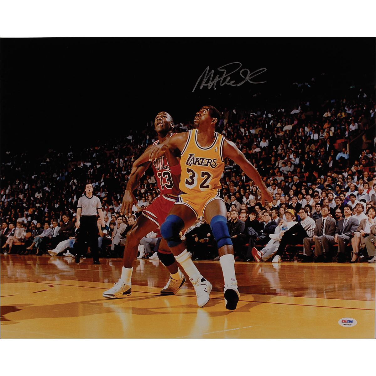 Color satin-finish 20 x 16 photo of Johnson battling Michael Jordan for a rebound, signed in silver ink. In very fine condition, with a PSA/DNA authentication label affixed to bottom.