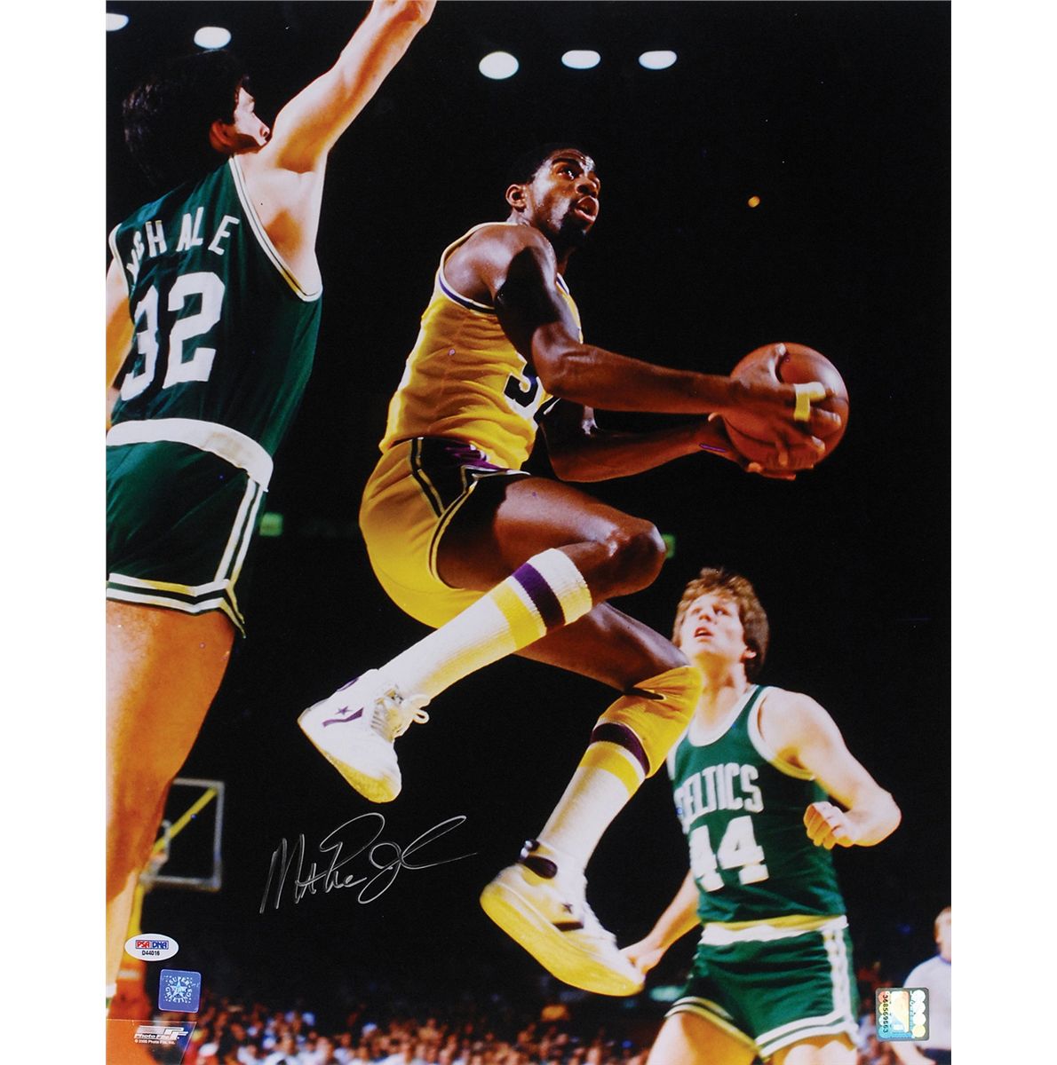 Color glossy 16 x 20 photo of Johnson driving to the basket against Kevin McHale and the Celtics, signed in silver ink by Johnson. In fine condition, with a PSA/DNA authentication label affixed to lower corner. Accompanied by a certificate of authenticity from PSA/DNA.